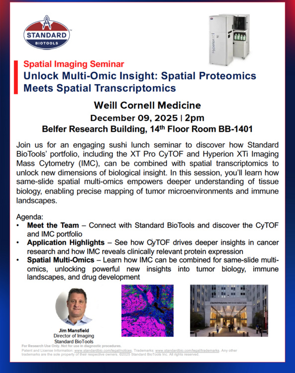 Join us for an engaging sushi lunch seminar to discover how Standard BioTools’ portfolio, including the XT Pro CyTOF and Hyperion XTi Imaging Mass Cytometry (IMC), can be combined with spatial transcriptomics to unlock new dimensions of biological insight. In this session, you’ll learn how same-slide spatial multi-omics empowers deeper understanding of tissue biology, enabling precise mapping of tumor microenvironments and immune landscapes.